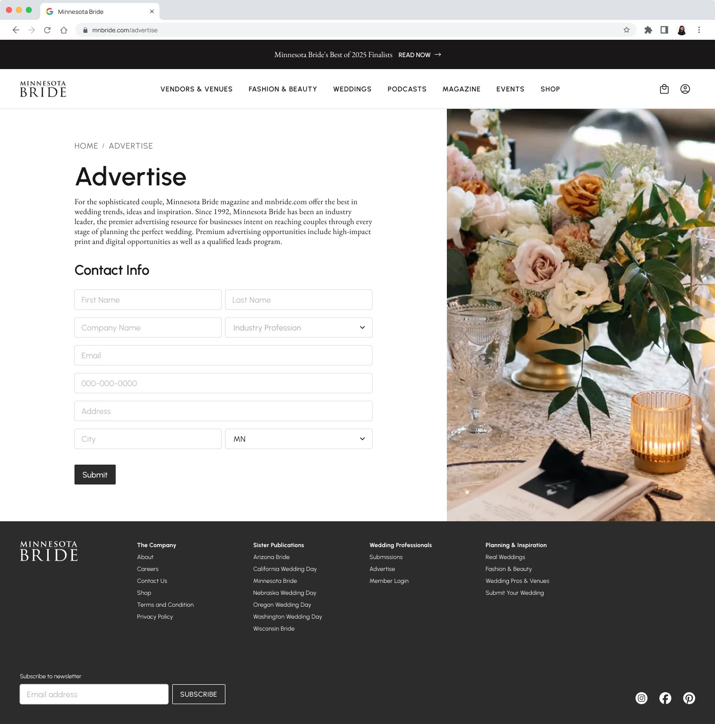 Modernizing a content-heavy bridal publication by improving information architecture, visual hierarchy, and scalable ad placements.