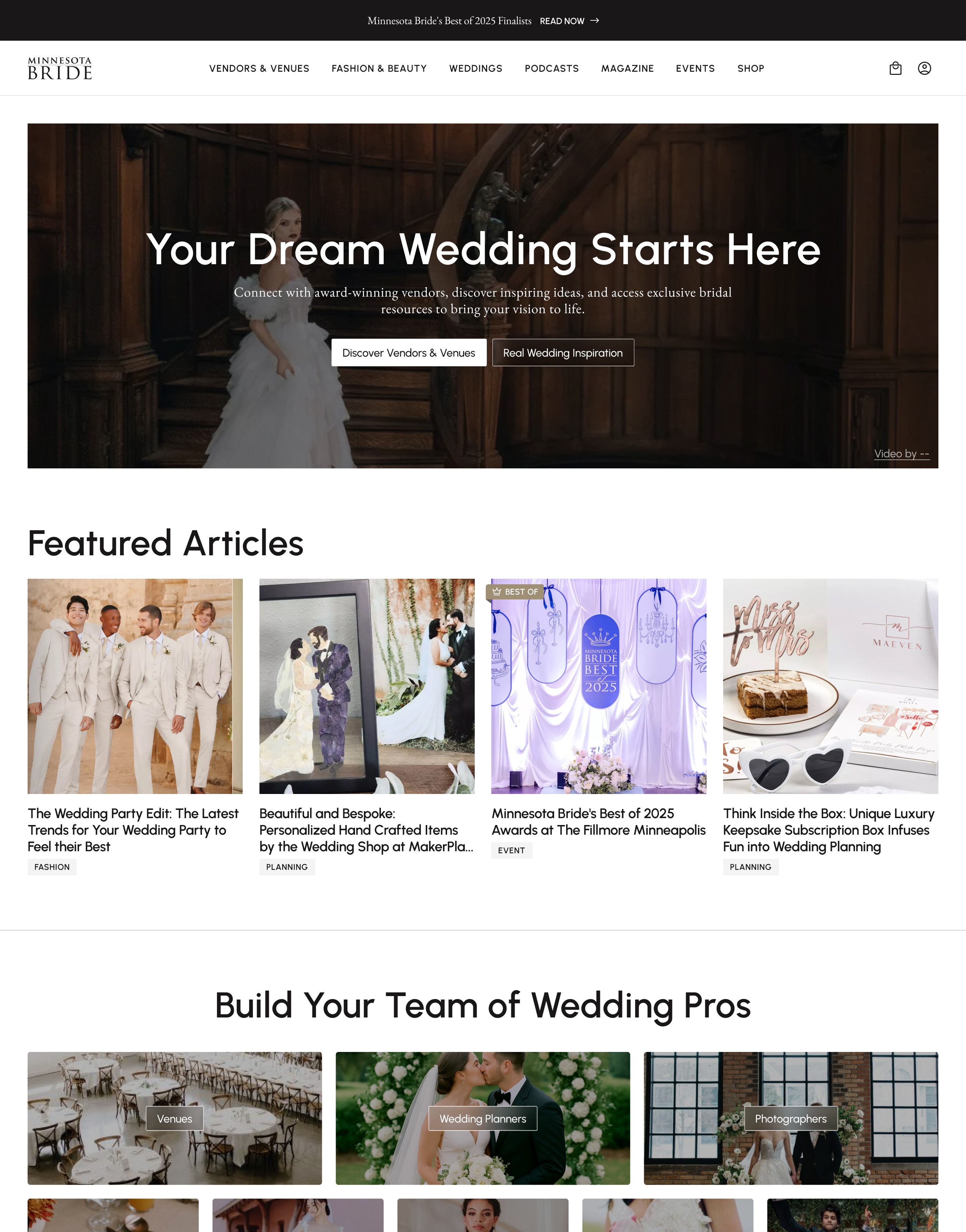 An end-to-end redesign of a bridal media platform that blends editorial storytelling, vendor discovery, and advertising.