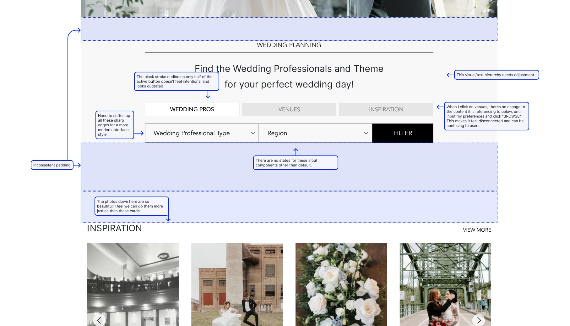 Content categories overlapped and lacked hierarchy, making it difficult for users to transition between inspiration, vendors, and editorial.
